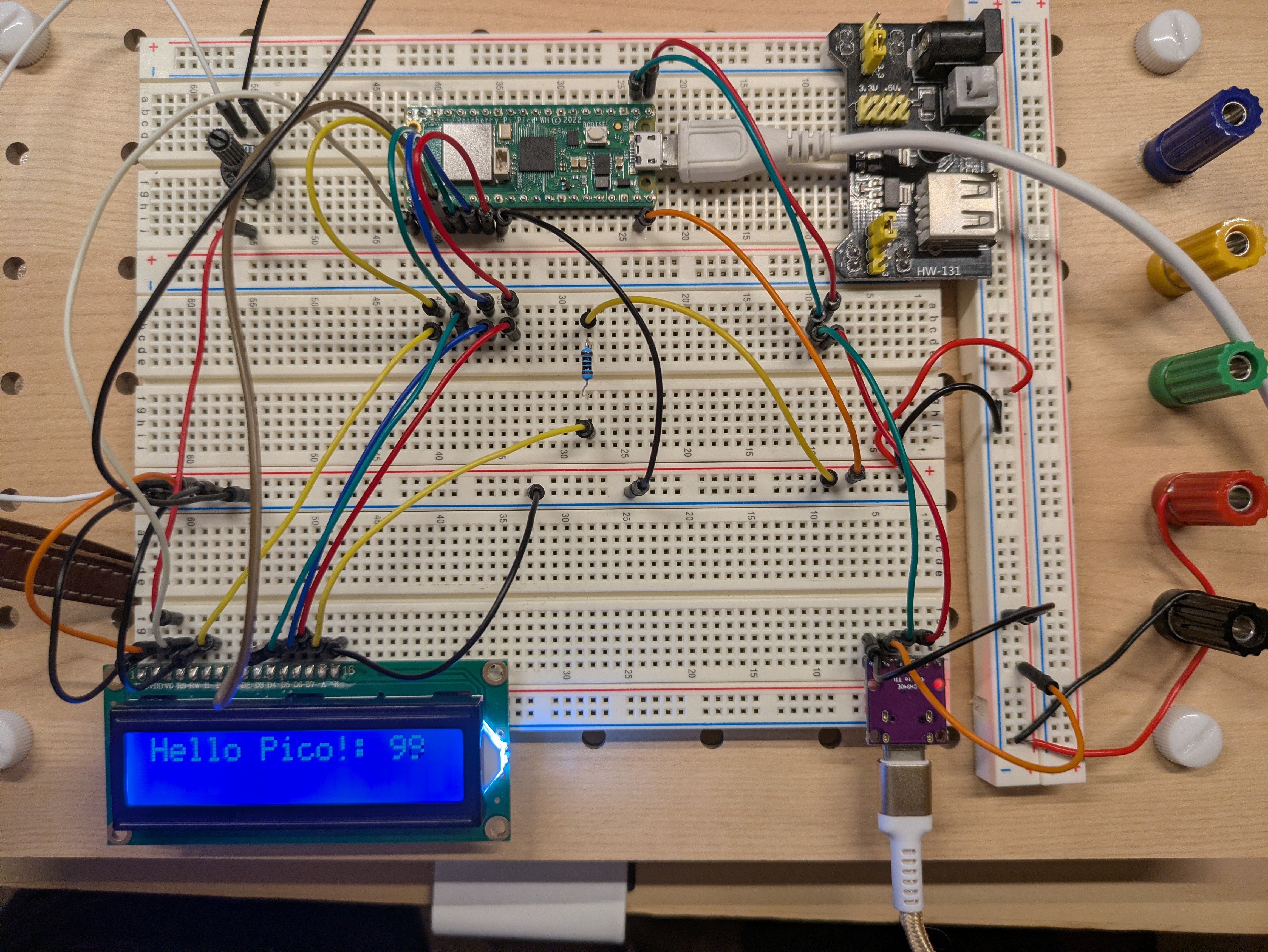 5.PicoとLCD1602とUSBシリアル変換器との配線写真を以下に示す。
